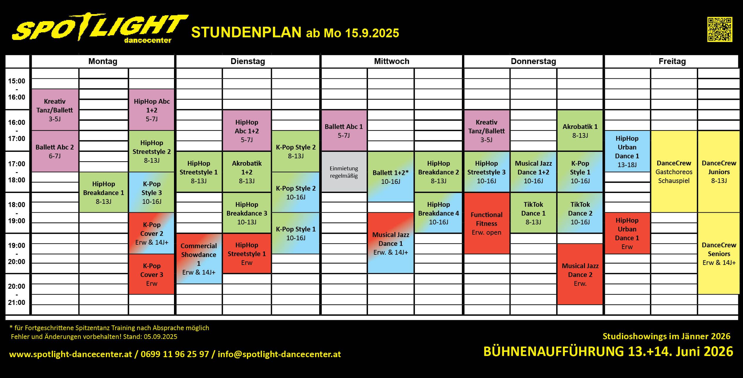 Da wir allen TänzerInnen den gleichen Stundenumfang bieten möchten, haben alle regulären Kurse 30 Einheiten im Tanzjahr (Sept.-Juni).